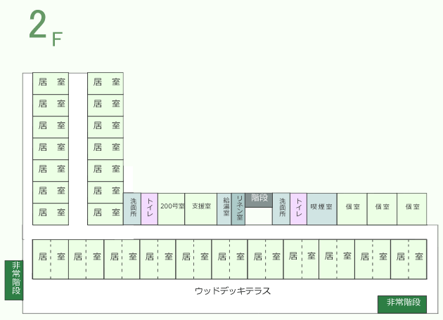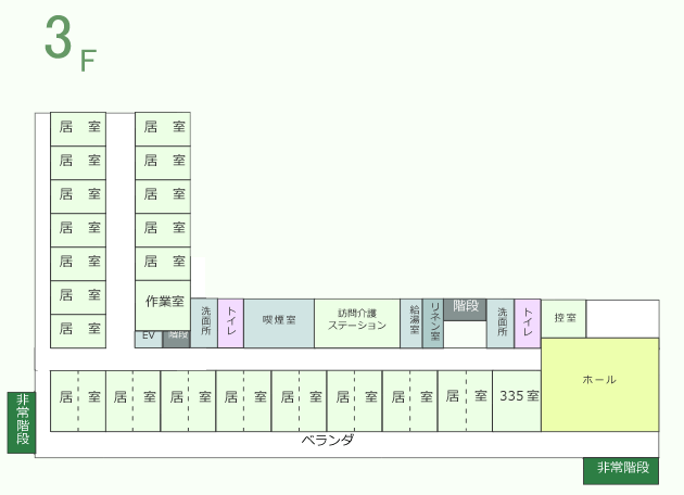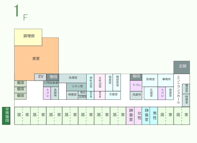 | 施設 | ロビー、ホール、多目的ホール、図書室、静養室、喫煙室、食堂、事務室、 支援室、医務室、調理場、浴場、2人部屋(81室)、1人部屋(6室) |