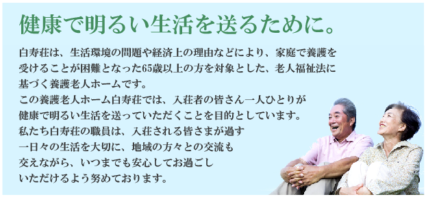 | 職員構成 | 施設長、嘱託医、事務員、生活相談員、支援員、看護師 栄養士、調理員、夜警員が毎日の生活を支援しています。 |